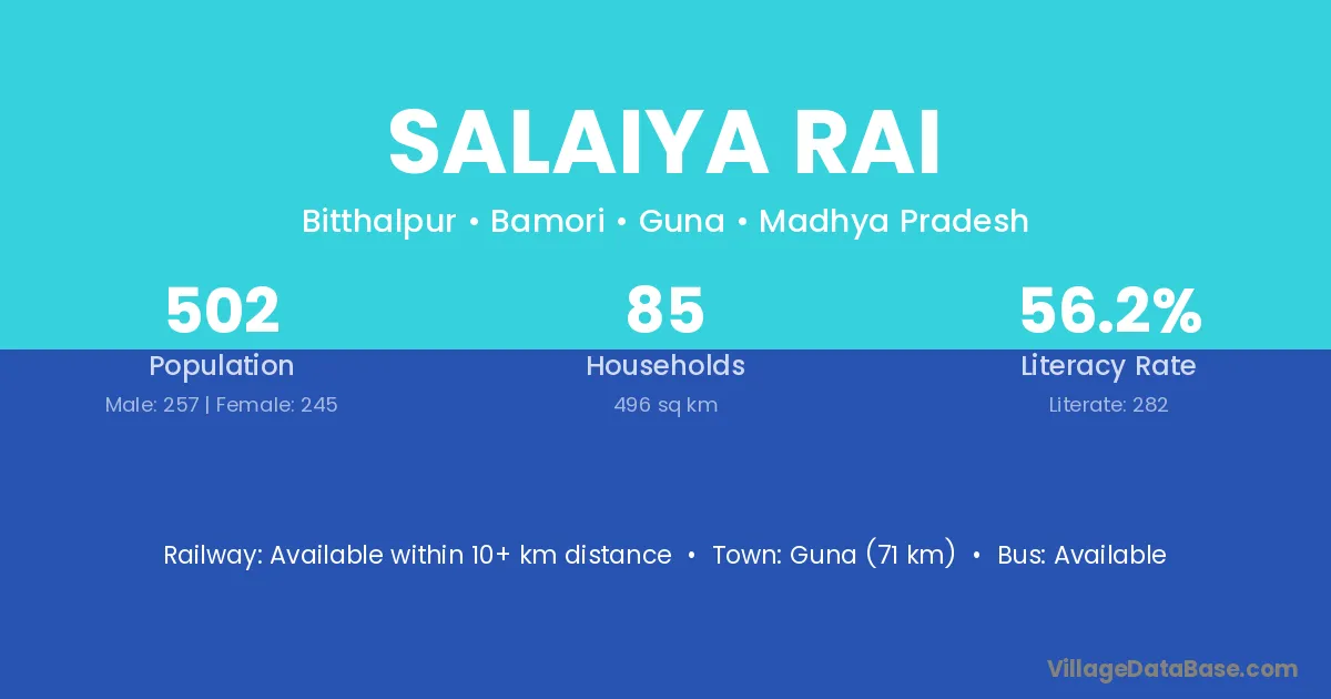 Guna (71 km) is the nearest town to Salaiya Rai village for major economic activities and is located approximately 71 km away.