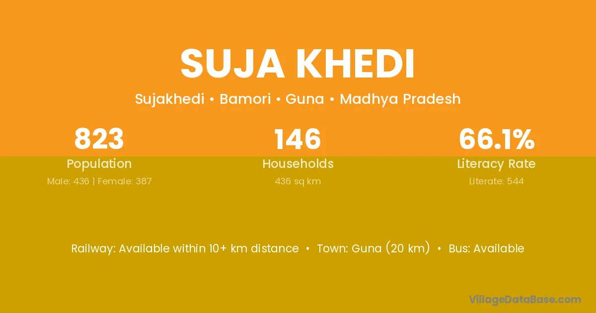 Guna (20 km) is the nearest town to Suja Khedi village for major economic activities and is located approximately 20 km away.