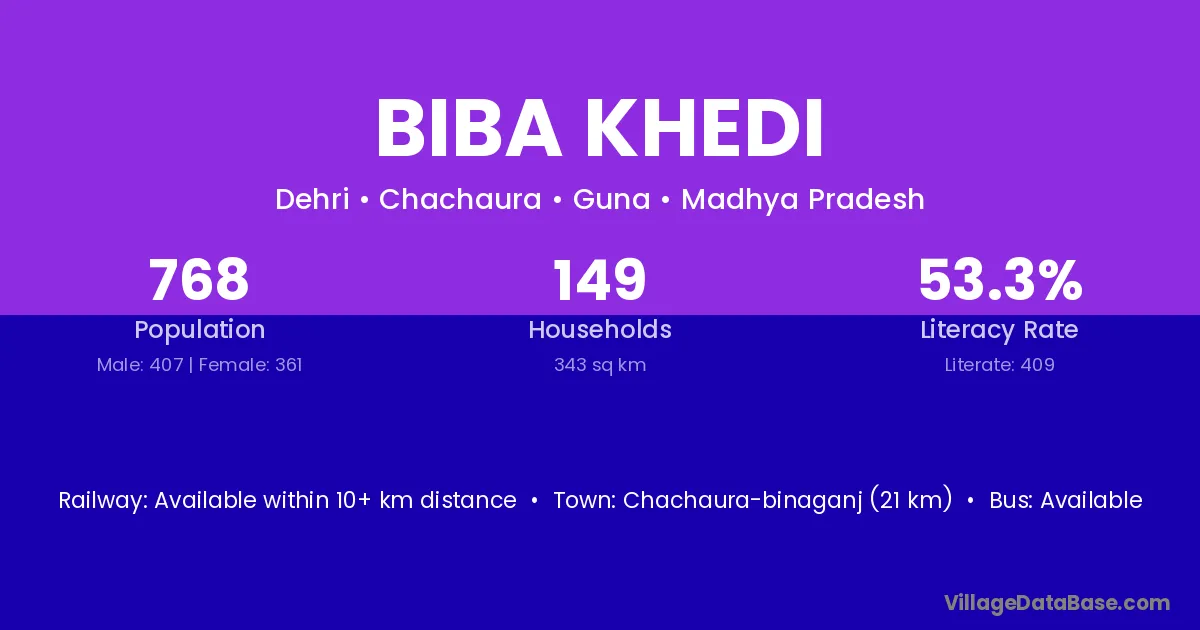 Biba Khedi village has a total population of 768 people, of which 407 are males and 361 are females.