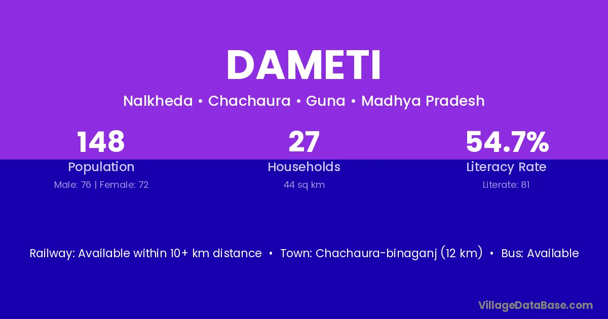 Dameti village has a total population of 148 people, of which 76 are males and 72 are females.