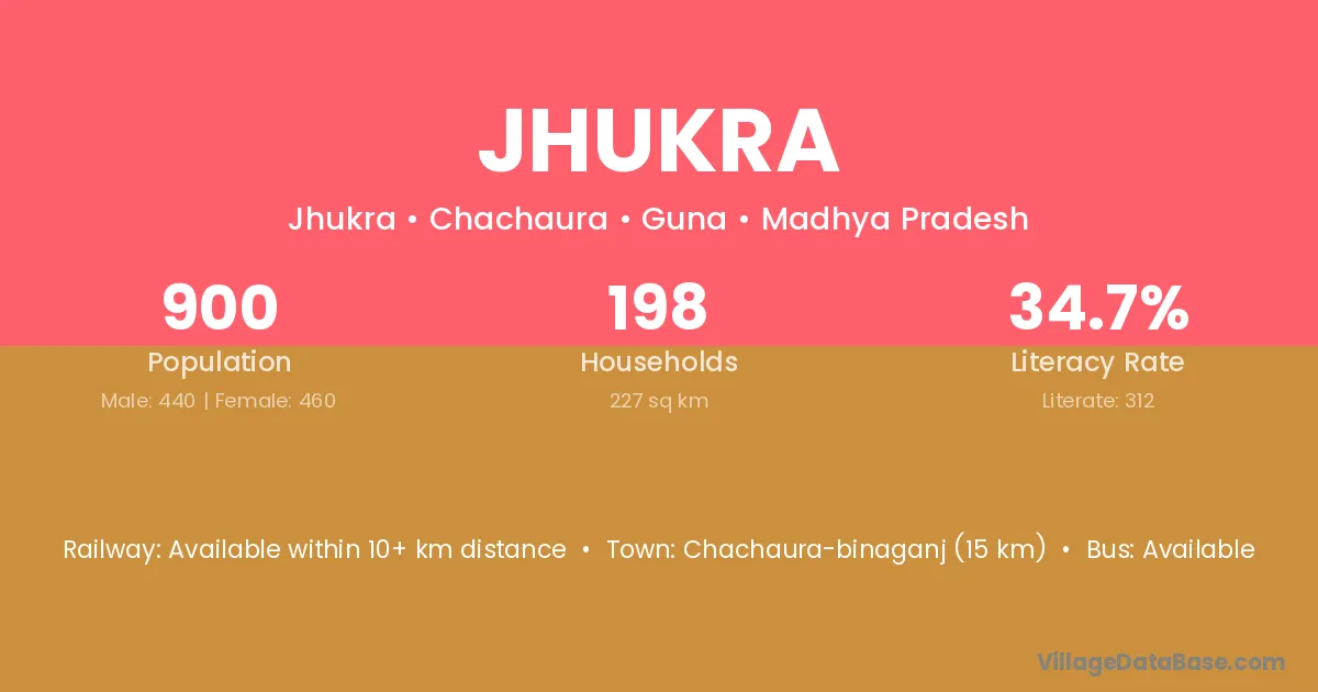 Chachaura-binaganj (15 km) is the nearest town to Jhukra village for major economic activities and is located approximately 15 km away.