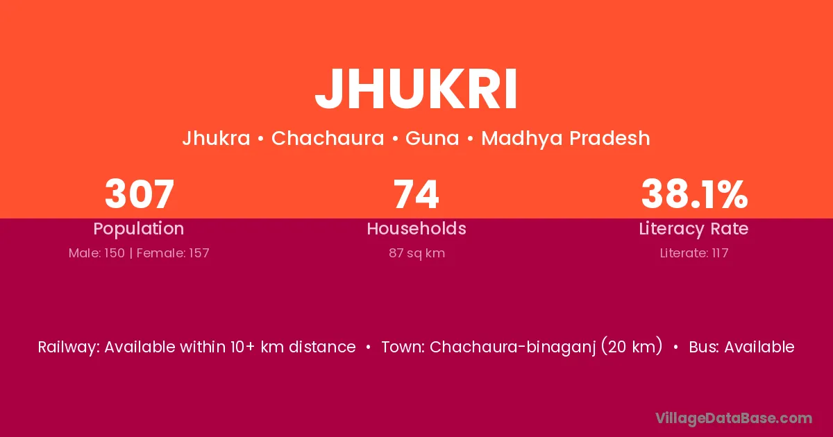 Chachaura-binaganj (20 km) is the nearest town to Jhukri village for major economic activities and is located approximately 20 km away.