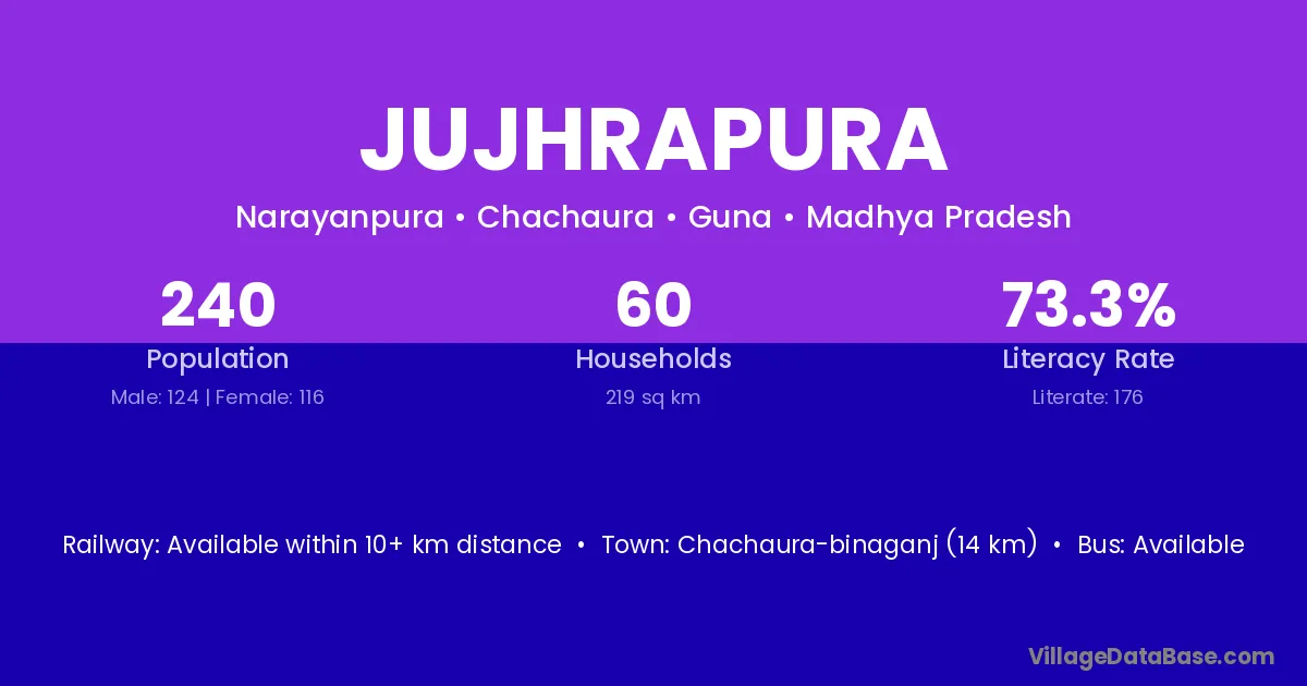 Jujhrapura village has a total population of 240 people, of which 124 are males and 116 are females.