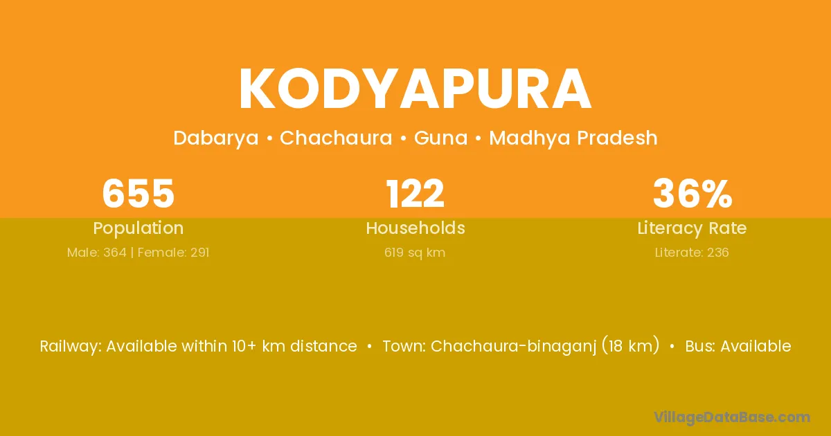 Chachaura-binaganj (18 km) is the nearest town to Kodyapura village for major economic activities and is located approximately 18 km away.