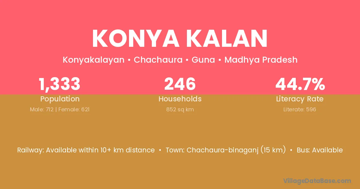 Konya Kalan village has a total population of 1,333 people, of which 712 are males and 621 are females.