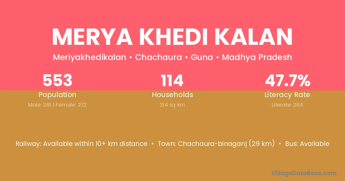 Merya Khedi Kalan village has a total population of 553 people, of which 281 are males and 272 are females.