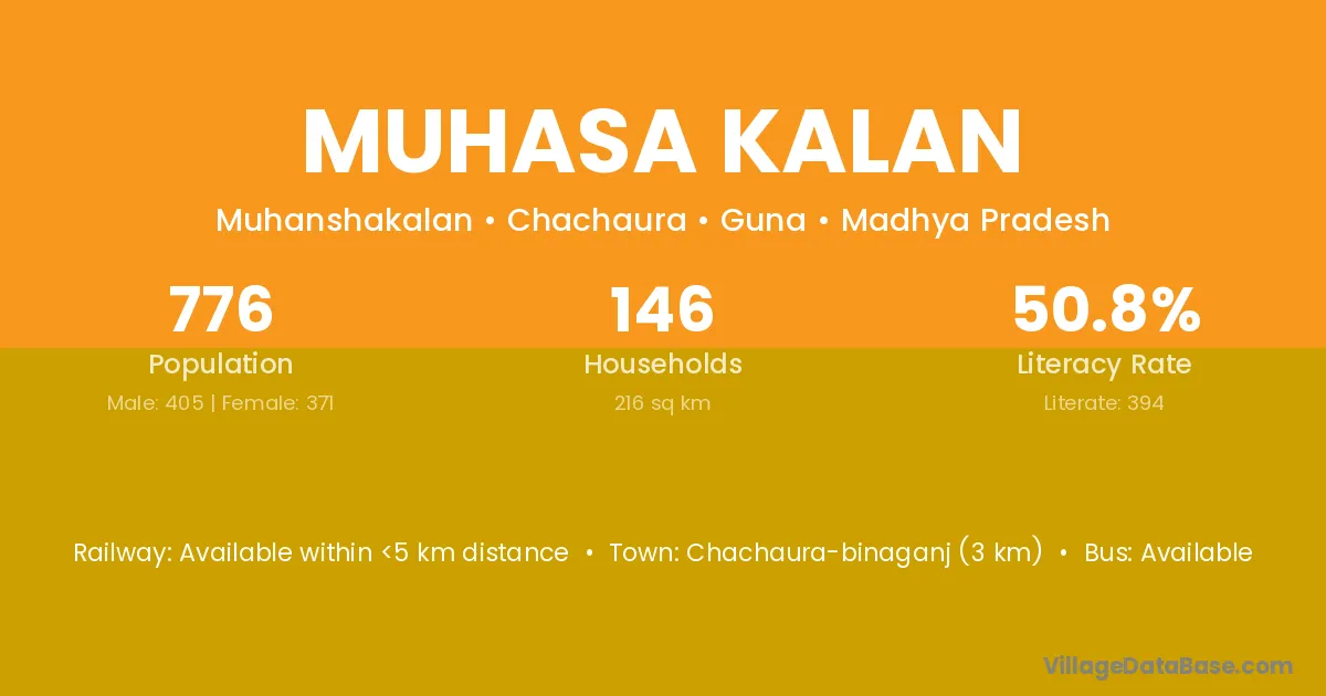 Muhasa Kalan village has a total population of 776 people, of which 405 are males and 371 are females.