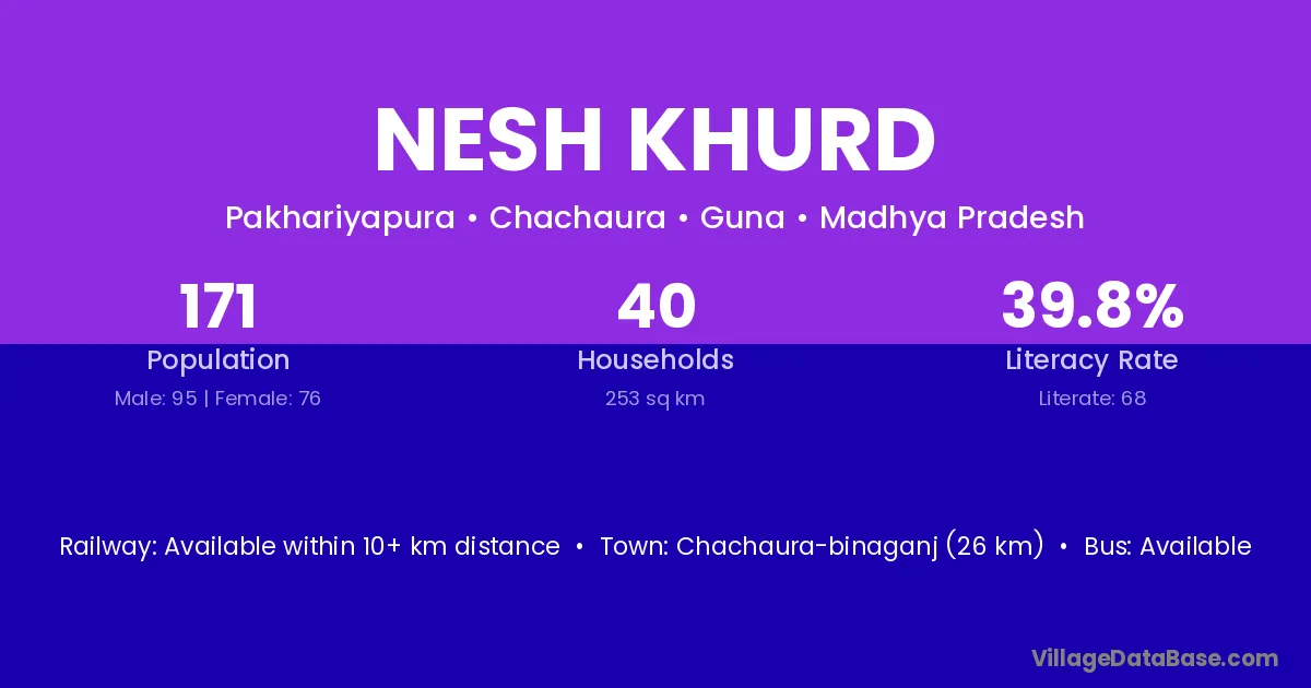 Chachaura-binaganj (26 km) is the nearest town to Nesh Khurd village for major economic activities and is located approximately 26 km away.