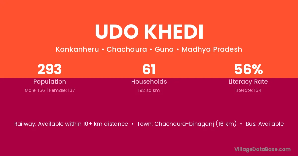 Udo Khedi village has a total population of 293 people, of which 156 are males and 137 are females.