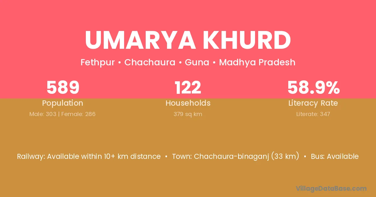 Chachaura-binaganj (33 km) is the nearest town to Umarya Khurd village for major economic activities and is located approximately 33 km away.