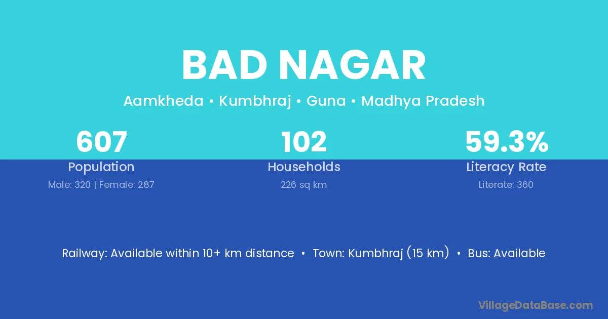Kumbhraj (15 km) is the nearest town to Bad Nagar village for major economic activities and is located approximately 15 km away.
