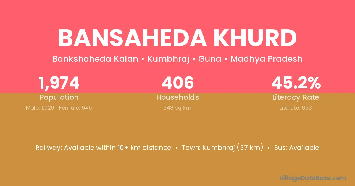 Bansaheda Khurd village has a total population of 1,974 people, of which 1,029 are males and 945 are females.