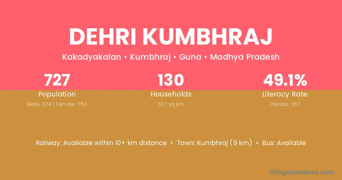 Dehri Kumbhraj village has a total population of 727 people, of which 374 are males and 353 are females.