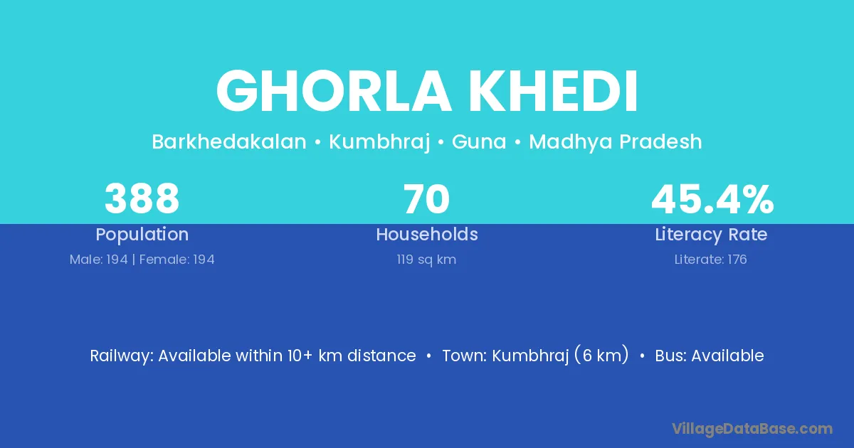 Ghorla Khedi village has a total population of 388 people, of which 194 are males and 194 are females.