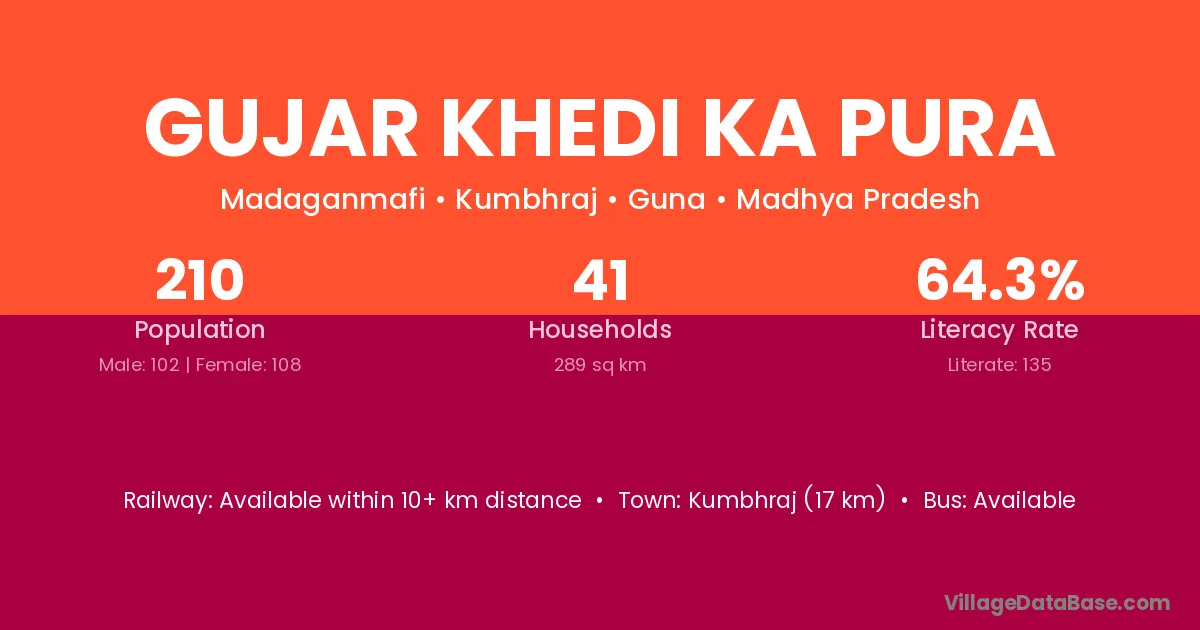 Gujar Khedi Ka Pura village has a total population of 210 people, of which 102 are males and 108 are females.