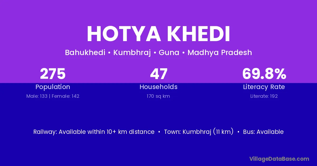 Hotya Khedi village has a total population of 275 people, of which 133 are males and 142 are females.