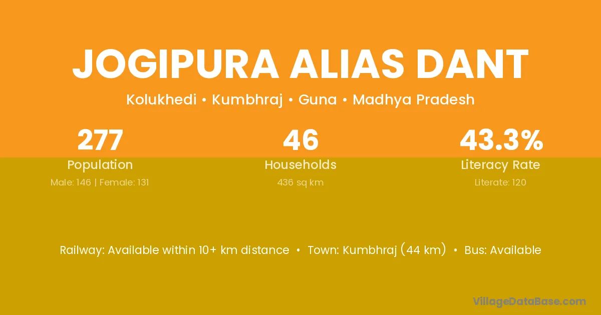 Jogipura Alias Dant village has a total population of 277 people, of which 146 are males and 131 are females.