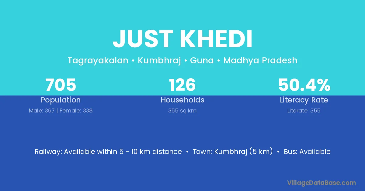 Kumbhraj (5 km) is the nearest town to Just Khedi village for major economic activities and is located approximately 5 km away.