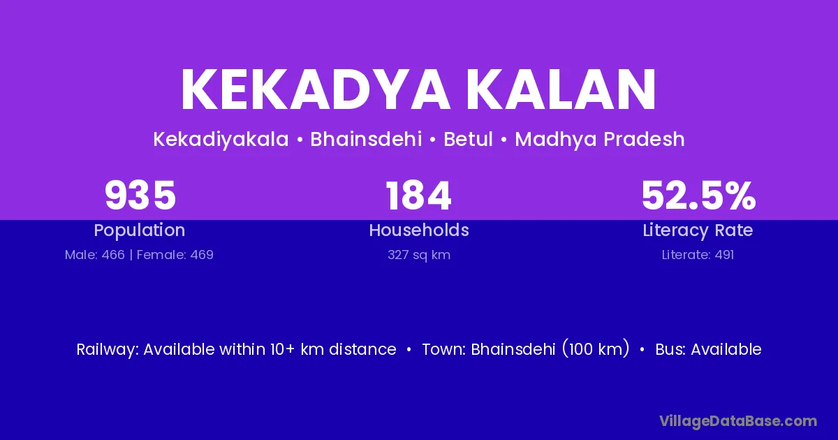 The literacy rate of Kekadya Kalan village is 48.17%. Male literacy stands at 61.81% and female literacy at 33.12%.