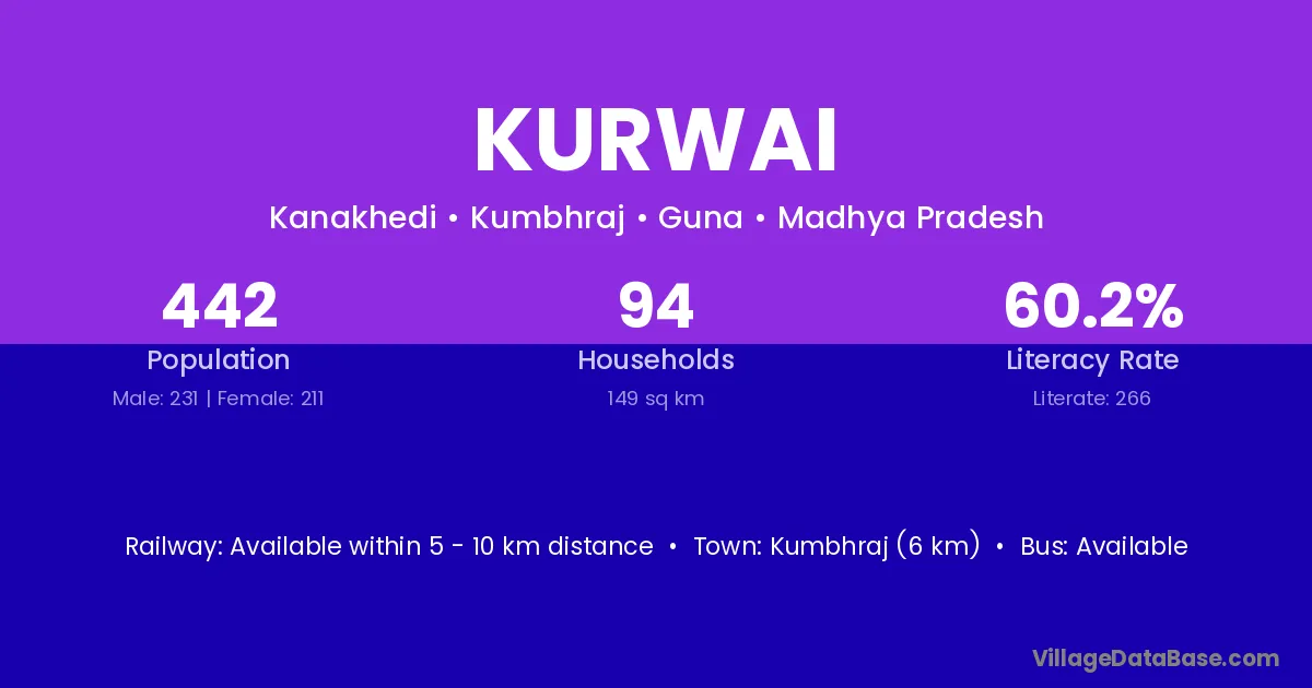 Kurwai village has a total population of 442 people, of which 231 are males and 211 are females.