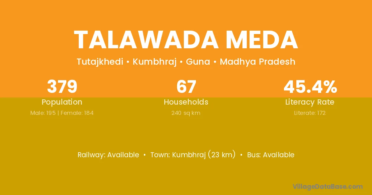 Kumbhraj (23 km) is the nearest town to Talawada Meda village for major economic activities and is located approximately 23 km away.