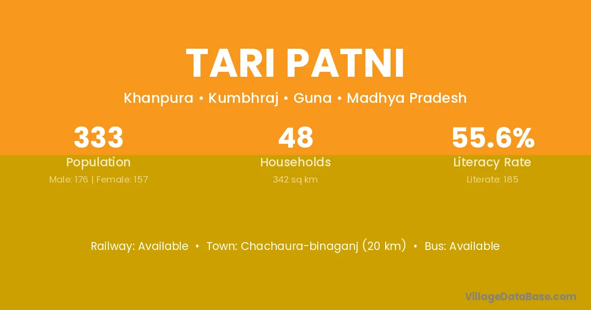 Tari Patni village has a total population of 333 people, of which 176 are males and 157 are females.