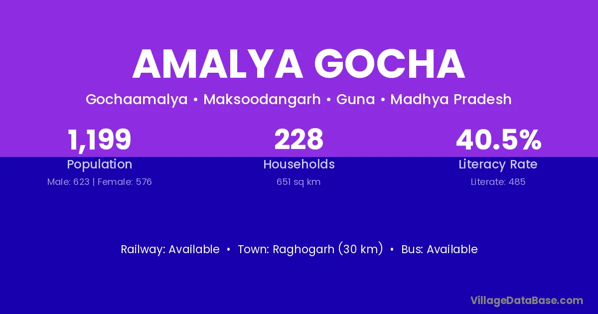 Raghogarh (30 km) is the nearest town to Amalya Gocha village for major economic activities and is located approximately 30 km away.
