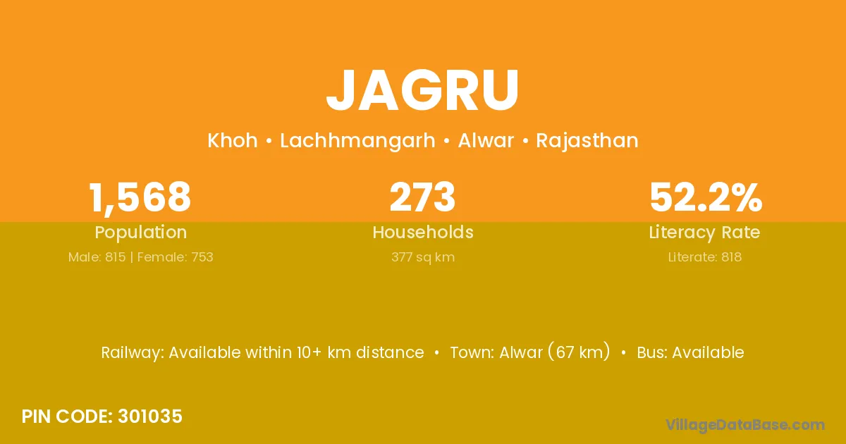 Raghogarh (45 km) is the nearest town to Jagru village for major economic activities and is located approximately 45 km away.
