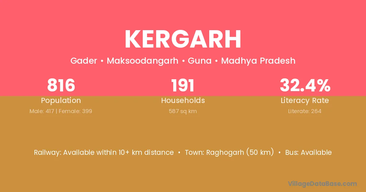 Raghogarh (50 km) is the nearest town to Kergarh village for major economic activities and is located approximately 50 km away.