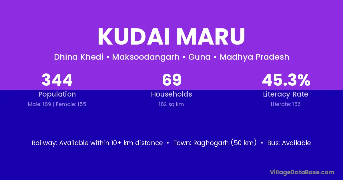 Raghogarh (50 km) is the nearest town to Kudai Maru village for major economic activities and is located approximately 50 km away.