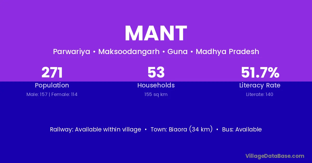 Mant village has a total population of 271 people, of which 157 are males and 114 are females.