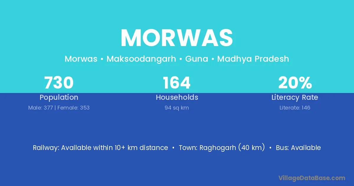 Raghogarh (40 km) is the nearest town to Morwas village for major economic activities and is located approximately 40 km away.