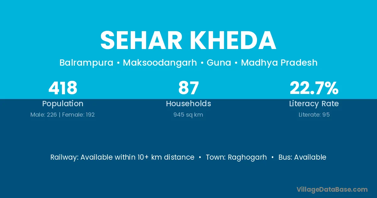 Raghogarh is the nearest town to Sehar Kheda village for major economic activities