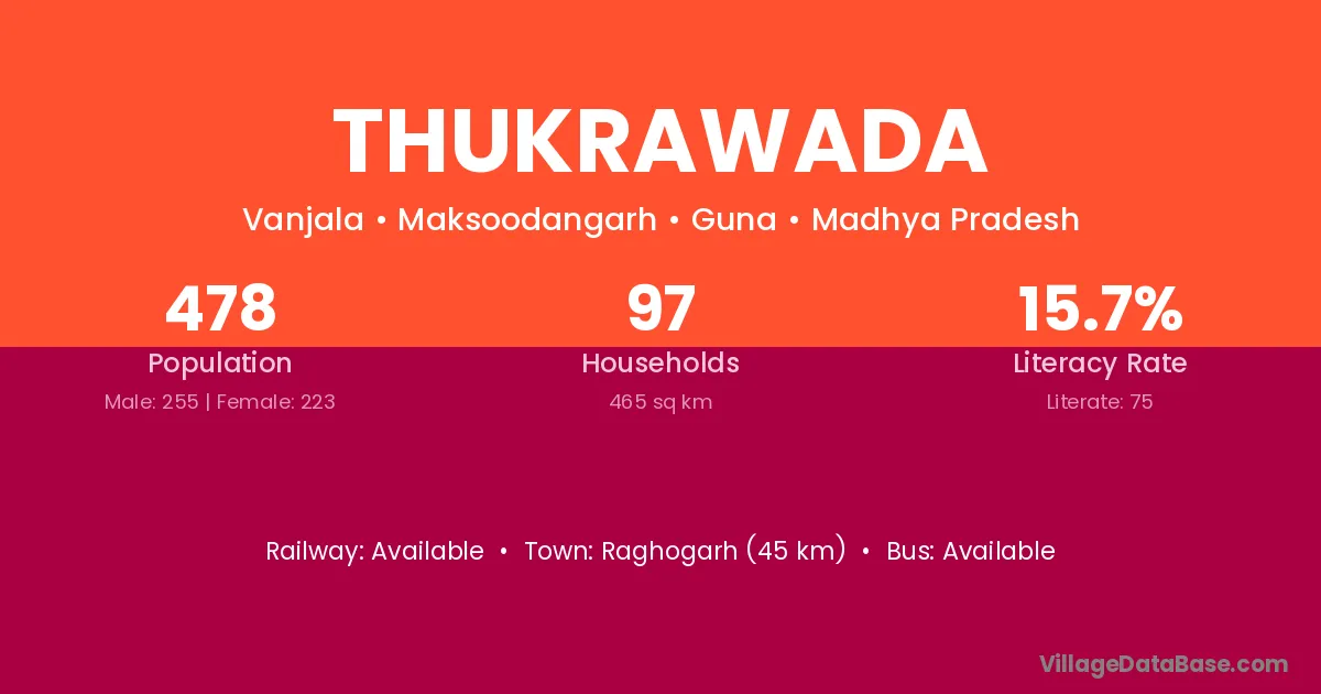 Raghogarh (45 km) is the nearest town to Thukrawada village for major economic activities and is located approximately 45 km away.
