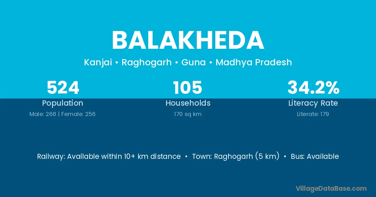 Raghogarh (5 km) is the nearest town to Balakheda village for major economic activities and is located approximately 5 km away.