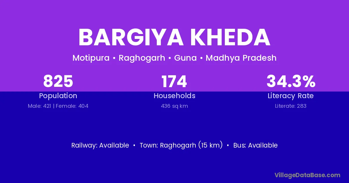 Raghogarh (15 km) is the nearest town to Bargiya Kheda village for major economic activities and is located approximately 15 km away.