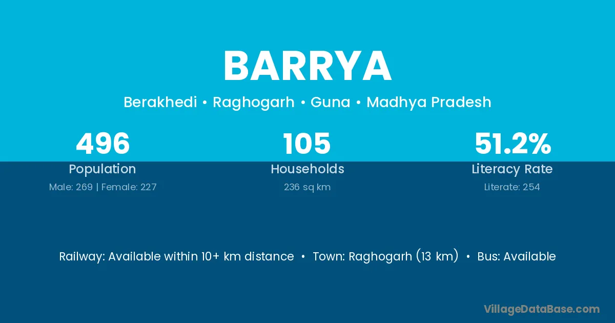Raghogarh (13 km) is the nearest town to Barrya village for major economic activities and is located approximately 13 km away.
