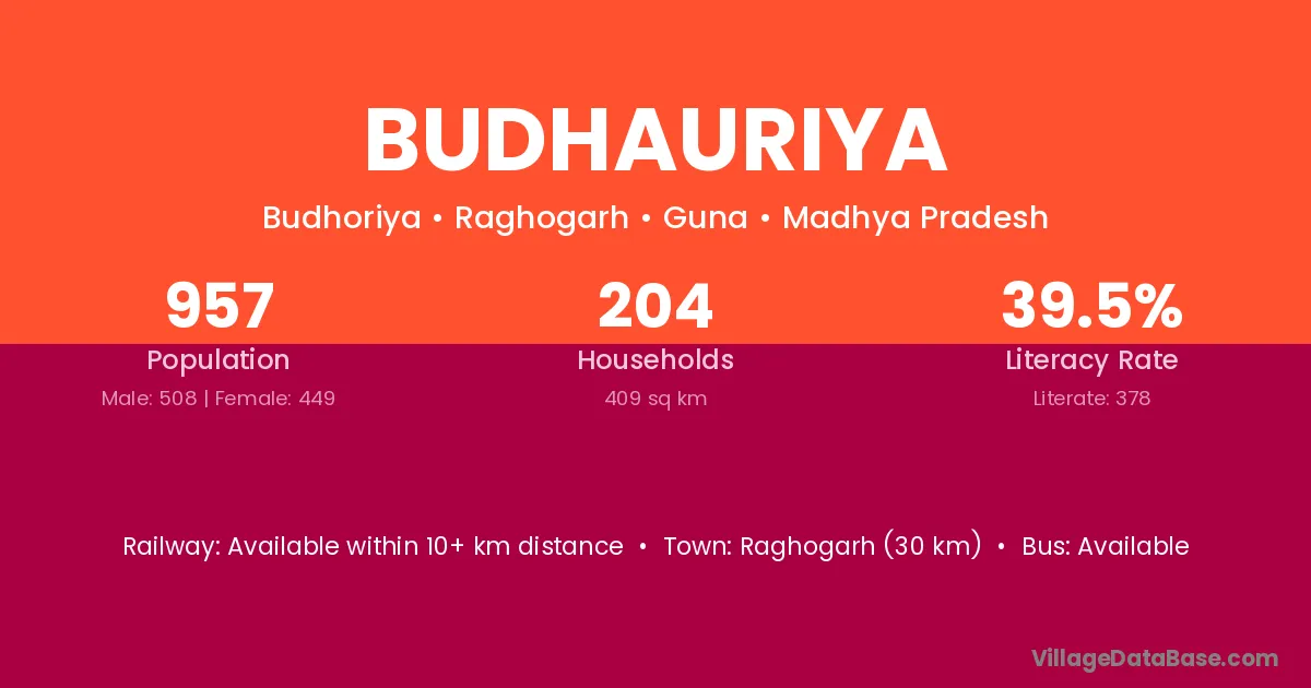 Raghogarh (30 km) is the nearest town to Budhauriya village for major economic activities and is located approximately 30 km away.
