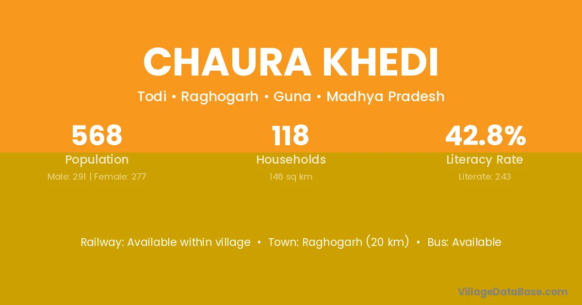 Raghogarh (20 km) is the nearest town to Chaura Khedi village for major economic activities and is located approximately 20 km away.