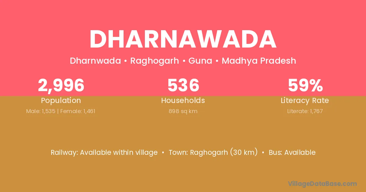 Raghogarh (30 km) is the nearest town to Dharnawada village for major economic activities and is located approximately 30 km away.
