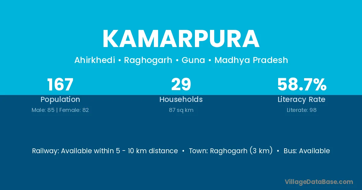 Raghogarh (3 km) is the nearest town to Kamarpura village for major economic activities and is located approximately 3 km away.