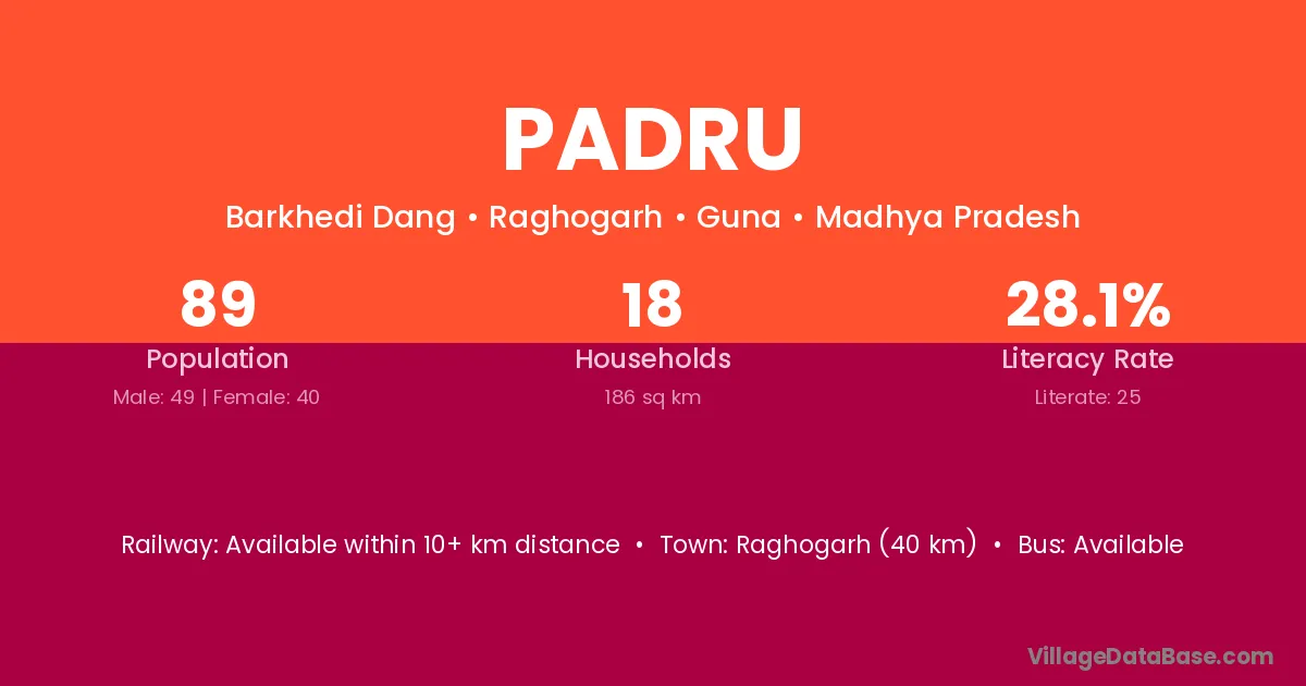 Raghogarh (40 km) is the nearest town to Padru village for major economic activities and is located approximately 40 km away.