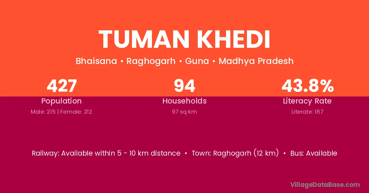 Tuman Khedi village has a total population of 427 people, of which 215 are males and 212 are females.