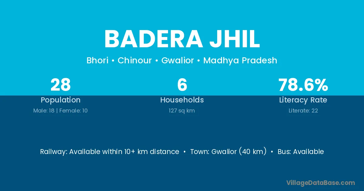 Gwalior (40 km) is the nearest town to Badera Jhil village for major economic activities and is located approximately 40 km away.