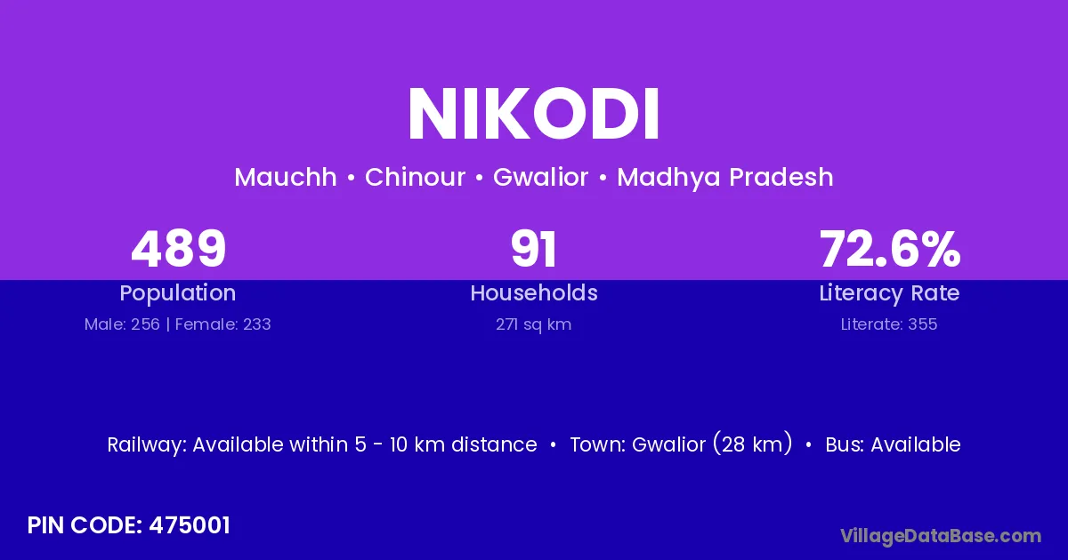 Gwalior (28 km) is the nearest town to Nikodi village for major economic activities and is located approximately 28 km away.