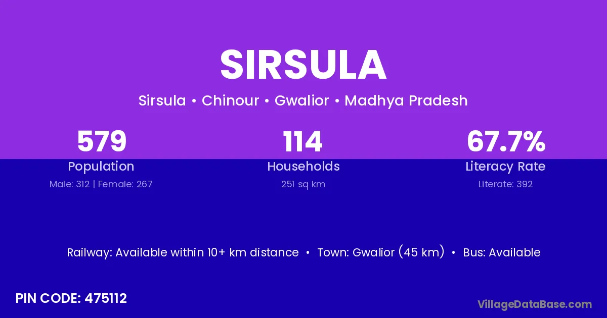 Gwalior (45 km) is the nearest town to Sirsula village for major economic activities and is located approximately 45 km away.