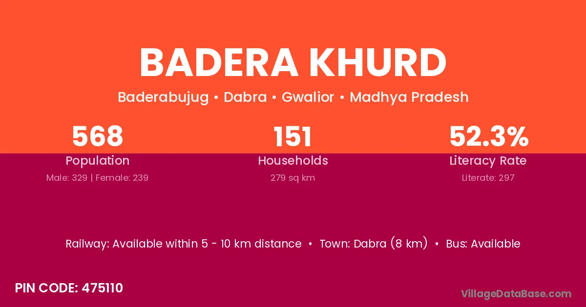 Dabra (8 km) is the nearest town to Badera Khurd village for major economic activities and is located approximately 8 km away.