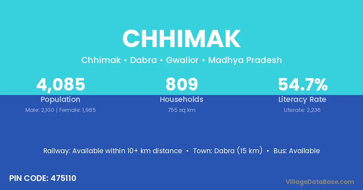 Dabra (15 km) is the nearest town to Chhimak village for major economic activities and is located approximately 15 km away.