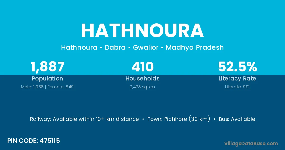 Pichhore (30 km) is the nearest town to Hathnoura village for major economic activities and is located approximately 30 km away.