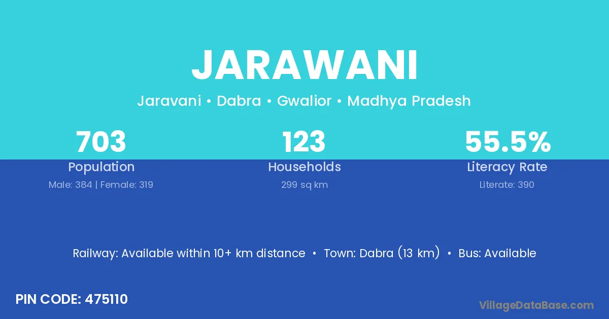 Dabra (13 km) is the nearest town to Jarawani village for major economic activities and is located approximately 13 km away.